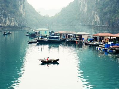 Vung Vieng is located in the heart of Bai Tu Long Bay, 24 km from the mainland. You are not only be immersed in the quiet and peaceful location viewing the charming landscape, and discovering the cultural life of the fishermen but also will be directed about sailing, pulling & dropping net off and fishing. You will be enchanted by the beauty of the boats, the nets in front of the house, the simple but hospitable fishermen, and the small children smiling as they go to school. This idyllic scene shows the traditional character of a fishing village on the sea.